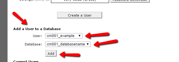 পরবর্তী, আপনার ডাটাবেসের জন্য আপনাকে অবশ্যই একটি ব্যবহারকারী তৈরি করতে হবে। সুতরাং একই পৃষ্ঠায়, মাইএসকিউএল ব্যবহারকারীদের কাছে স্ক্রোল করুন এবং একটি নতুন ব্যবহারকারী তৈরি করুন: