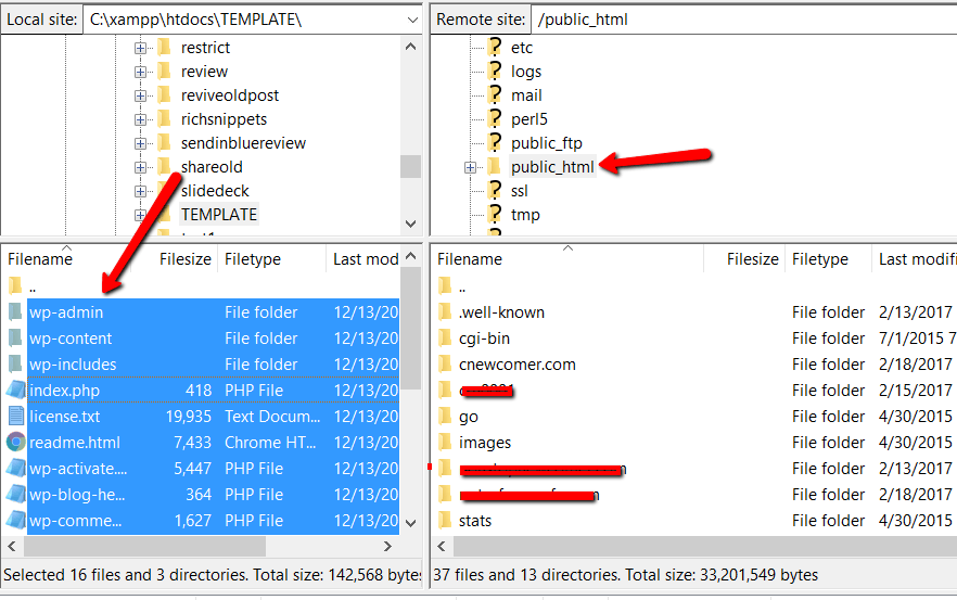 তারপরে ফাইলটি আনজিপ করুন এবং এটিকে public_htmlআপনার ওয়েবসাইটের (বা অনুরূপ) ডিরেক্টরিতে আপলোড করুন । আপনি যদি এফটিপিতে লগ ইন করবেন তা নিশ্চিত না হন তবে আপনার হোস্টকে আপনার এফটিপি অ্যাকাউন্টের তথ্যের জন্য জিজ্ঞাসা করুন: